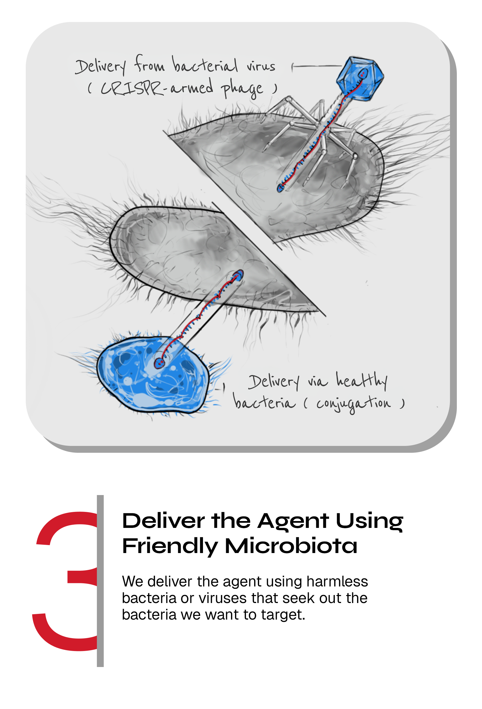 CRISPR-armed phages: We incorporate our CRISPR-guided vectors comprising the CRISPR-Cas systems into the genome of bacteriophages (phages are viruses that only kill bacteria) to use them as CRISPR-delivery vehicles. Phages are everywhere outside and inside your body and are completely harmless to humans.